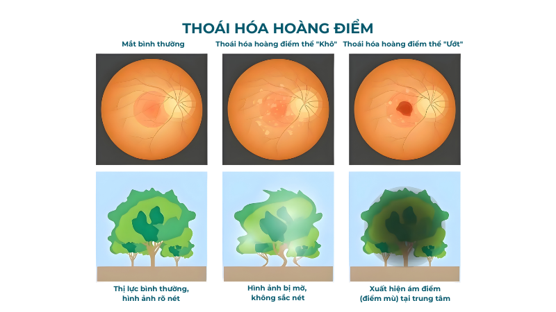 - Ảnh hưởng: Khi hoàng điểm bị thoái hóa, bệnh nhân sẽ gặp khó khăn trực tiếp trong khả năng nhìn chi tiết, đọc chữ và nhận diện khuôn mặt, trong khi thị lực ngoại vi thường không bị ảnh hưởng.