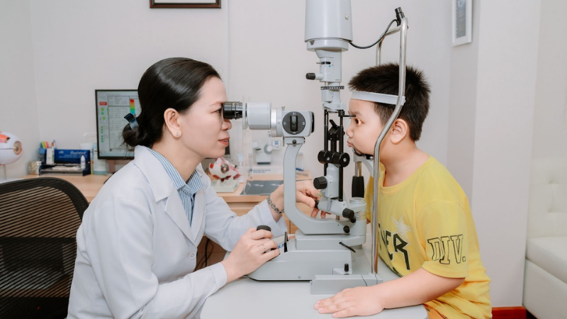 Bác sĩ thăm khám và đánh giá thị lực trước khi tập nhược thị nâng cao cho bé