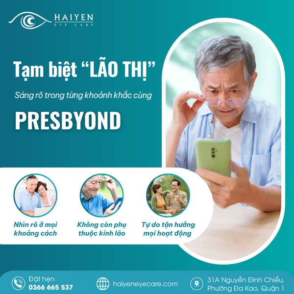 Bạn đang ở độ tuổi ngoài 40 và bắt đầu cảm thấy những dấu hiệu quen thuộc như khó khăn khi đọc chữ nhỏ trên điện thoại hay sách báo, phải nheo mắt hoặc đưa vật ra xa mới nhìn rõ, hay luôn phải tìm cặp kính lão mỗi khi cần nhìn gần? Những phiền toái này không chỉ gây bất tiện trong sinh hoạt hàng ngày mà còn làm giảm sự tự tin của bạn. Đừng để "lão thị" làm gián đoạn những niềm vui trong cuộc sống. Đã đến lúc nói lời tạm biệt với những phiền toái đó nhờ PRESBYOND – giải pháp đột phá giúp khôi phục thị lực, mang lại tầm nhìn sáng rõ ở mọi khoảng cách.